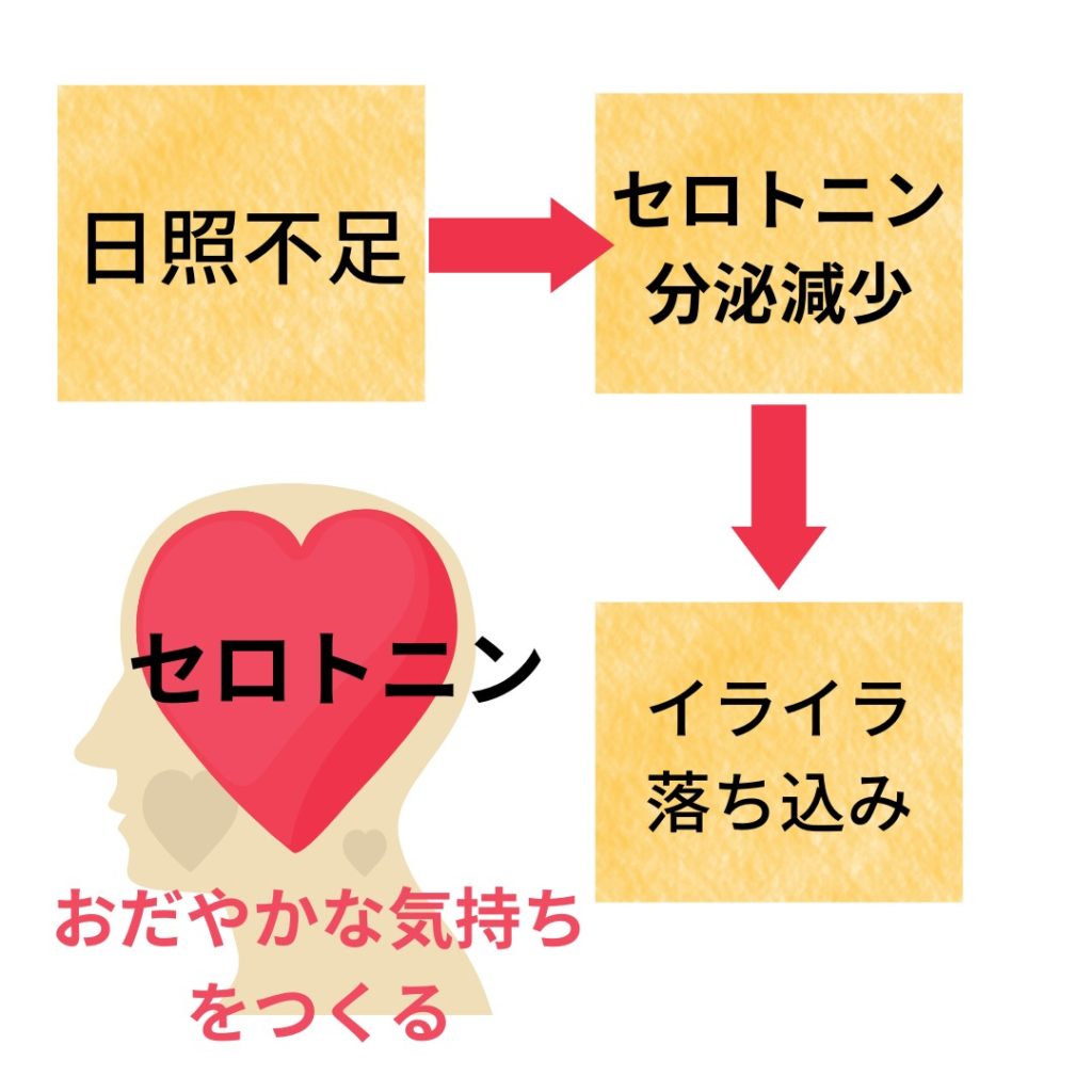 ウインターブルーの原因は幸せホルモンのセロトニンの分泌量の減少があります。太陽の光を浴びる時間が減ると脳内伝達物質のセロトニンが減少するため、冬の様な光が少なくなる季節にイライラしたり気分が落ち込み安くなります。