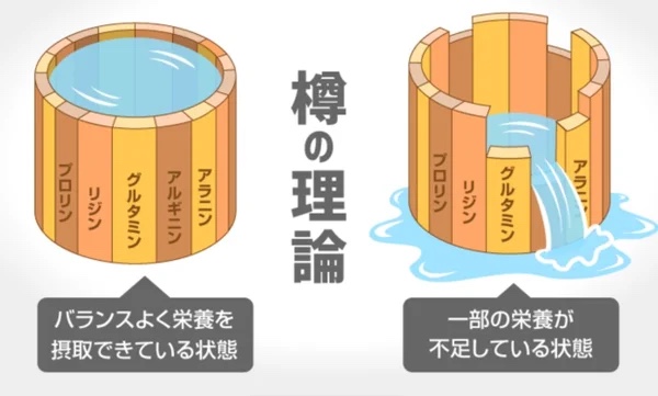 もし、9個のうち1つでも摂れてないと他のアミノ酸も摂れてないと一緒になって1番低い必須アミノ酸のレベルになるってこと💦