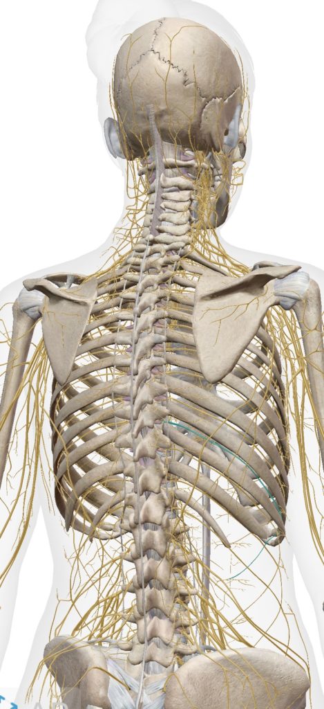 背骨の間から黄色い神経が沢山出てますね、それが体の末端まで枝分かれをしていきます!