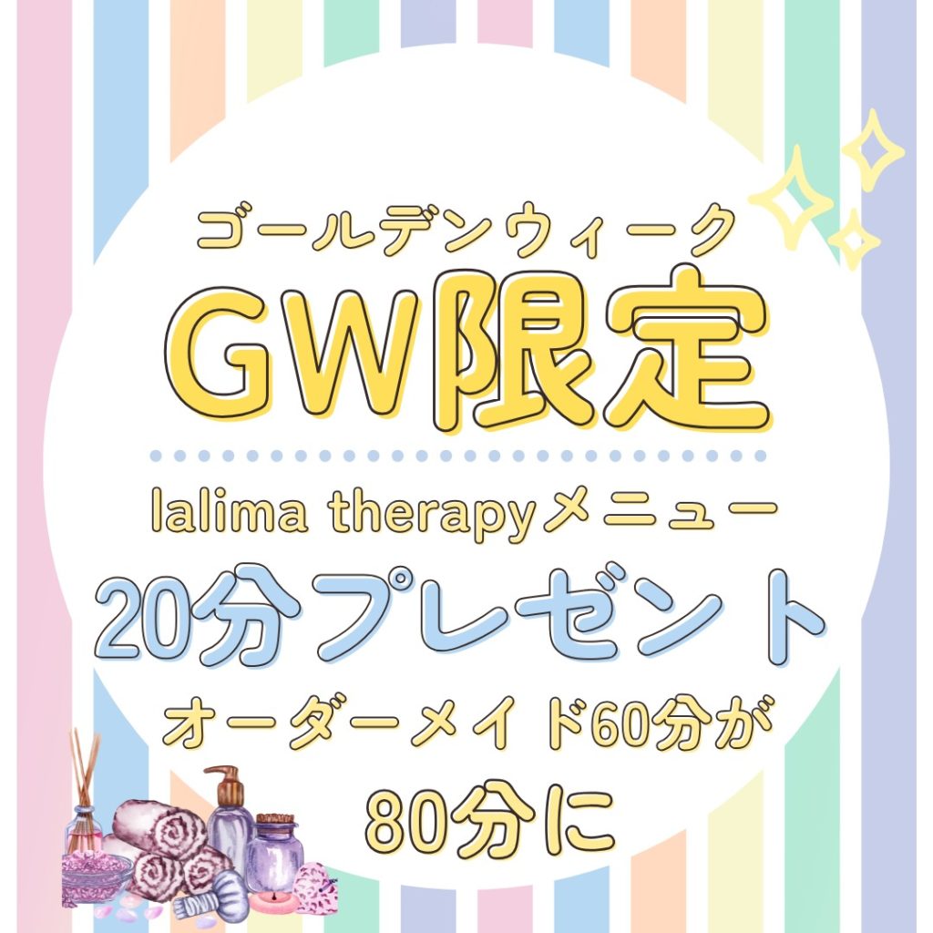 ゴールデンウィーク☀️✨✨!! 旅行される方やゆっくりされる方色々ですね😊 今年はお仕事させていただきます! lalimaゴールデンウィークプレゼント🎁をします🎁 オーダーメイド60分 9,600円 をご予約の皆様に20分のプレゼント🎁 3500円もお得🉐になります L...